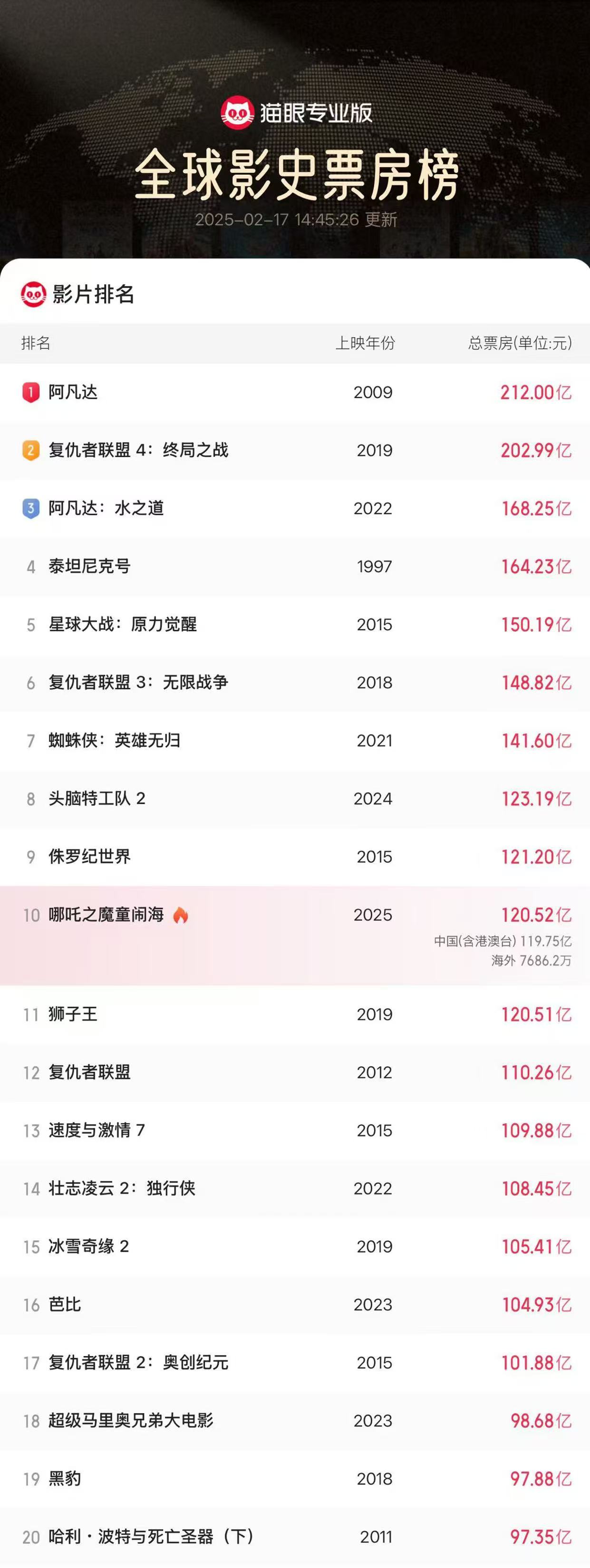 至此,群众电影票房榜前十为:《阿凡达》(2009年,212亿)、《复仇者定约4:终端之战》(2019年,202.99亿),《阿凡达:水之谈》(2022年,168.25亿),《泰坦尼克号》(1997年,164.23亿),《星球大战:原力醒悟》(2015年,150.19亿)、《复仇者定约3:无尽战斗》(2018年,148.82亿)、《蜘蛛侠:英豪无归》(2021年,141.60亿)、《头脑特工队2》(2024年,123.19亿)、《侏罗纪寰宇》(2015年,121.20亿)、《哪吒之魔童闹海》(2025年,超120.52亿,数据仍抓续更新)。
