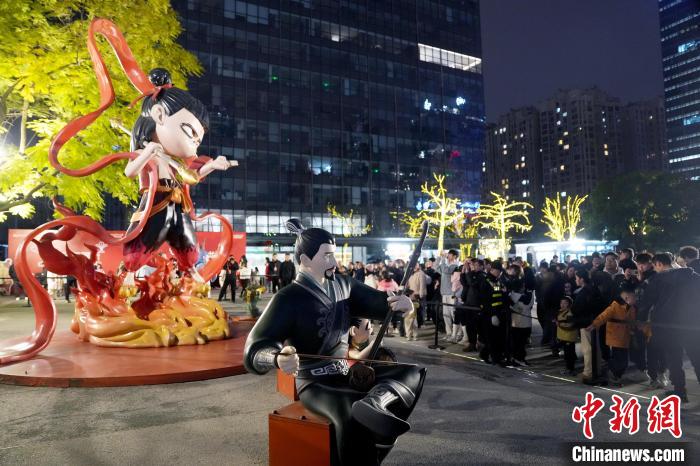 2月12日晚,四川成都市民打卡哪吒雕像。中新社记者 安源 摄